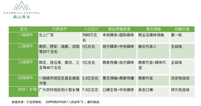 ? 銷售渠道下沉。高端消費品做品牌,低端消費品做渠道。中國城鄉(xiāng)差異巨大,有7.5億廣大人群的農(nóng)村,特別是3.5億人口的四線城鎮(zhèn)才是大多數(shù)消費品的決定性戰(zhàn)場(見下圖)。小米之家在過去一年半全國開了一百多家門店,勢如破竹。我們把這一機會背后的驅(qū)動力也歸結為“好”字訣,對應的其實是3~5線城市消費人群的消費升級。